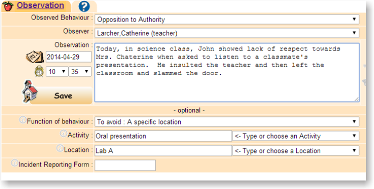 Your school's code of conduct will be inserted in your Behaviour Barometer, making an observation entry really easy. The observation may include fields compatible with the PBIS (Positive Behavioral Interventions & Supports) approach such as : • Function of Behaviour • Activity when the behaviour occured and its Location :